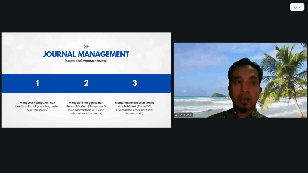 Pada sesi ini, Muhammad Yunus, S.Kom., M.Kom. memaparkan secara komprehensif mengenai alur kerja editorial dan proses penerbitan jurnal berbasis Open Journal Systems (OJS) yang mengacu pada standar global dari Public Knowledge Project (PKP).