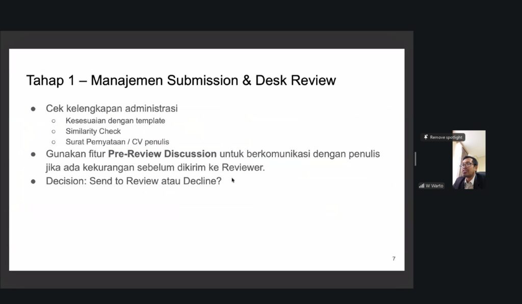 Pada sesi selanjutnya, Warto juga membahas alur kerja editorial yang lebih fleksibel pada OJS 3. Platform ini membagi proses penerbitan artikel menjadi empat tahapan utama, yaitu submission, review, copyediting, dan production. Di setiap tahapannya, pengelola jurnal diberikan pemahaman tentang bagaimana cara menjalankan proses ini dengan lebih efisien dan terstruktur. Para peserta juga diajarkan untuk memanfaatkan fitur Review Forms yang dapat membantu membuat penilaian reviewer lebih terstandarisasi dan objektif. Selain itu, penting untuk memantau tenggat waktu bagi reviewer agar proses publikasi dapat berjalan tepat waktu.