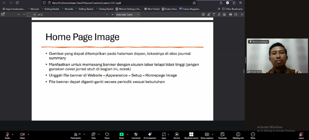 Pada awal pemaparannya, Dani menjelaskan bahwa custom OJS 3 merupakan proses penyesuaian tampilan Open Journal Systems (OJS) dengan memanfaatkan theme default dan custom CSS untuk menciptakan desain jurnal yang tidak hanya konsisten tetapi juga menarik bagi pembaca dan penulis. Dani kemudian melanjutkan penjelasannya dengan membahas beberapa elemen utama yang dapat disesuaikan dalam OJS 3. Pada bagian header, Dani menekankan pentingnya penempatan logo jurnal, serta pengaturan menu utama dan navigasi pengguna agar pembaca dapat dengan mudah menemukan informasi yang mereka butuhkan. Selanjutnya main content, Dani menekankan pentingnya pengaturan homepage image untuk membuat tampilan awal jurnal lebih memikat dan memberi kesan profesional. Penulisan journal summary juga penting karena berisi informasi esensial seperti ISSN, prefix DOI, status akreditasi, periode terbitan, serta fokus dan scope jurnal.