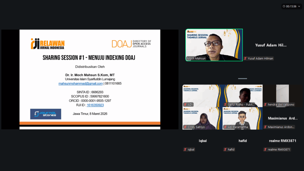 Minggu, 08 Maret 2026 – Pengurus Daerah Relawan Jurnal Indonesia Jawa Timur (Pengda RJI Jatim) menyelenggarakan kegiatan produktif selama bulan Ramadhan bertajuk Sharing Session: Tadarus Jurnal dengan tema “Menuju Indexing DOAJ”. Kegiatan yang dipandu langsung oleh Dr. Ir. Moch Mahsun, S.Kom., M.T. ini diikuti oleh 89 dosen dan pengelola jurnal dari berbagai institusi di Indonesia. Menariknya, jumlah peserta yang hadir mencapai 80 orang, melebihi target awal panitia yang menargetkan 40 peserta. Tingginya partisipasi ini menunjukkan besarnya minat para dosen dan pengelola jurnal terhadap upaya peningkatan kualitas pengelolaan jurnal ilmiah, khususnya dalam mempersiapkan jurnal menuju indeksasi Directory of Open Access Journals (DOAJ).