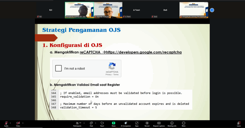 Sebagai pembuka, Mesran mengungkapkan beberapa tantangan utama yang sering dihadapi oleh pengelola jurnal, seperti ketidaktahuan tentang potensi kerentanan terhadap ancaman digital, kurangnya keahlian IT di kalangan pengelola jurnal, serta keterbatasan akses ke CPanel dan pemahaman mengenai sistem keamanan OJS (Open Journal System). Menurut Mesran, kurangnya pengetahuan mengenai aspek teknis ini sering kali menyebabkan jurnal menjadi sasaran bagi peretasan dan penyebaran konten yang tidak sesuai. Untuk mengatasi tantangan tersebut, Mesran menawarkan sejumlah solusi praktis. Beberapa langkah pengamanan yang disarankan antara lain adalah pemasangan reCAPTCHA untuk mencegah serangan bot, validasi email saat proses registrasi untuk memastikan keaslian pengguna, serta membatasi jenis dan ukuran file yang diunggah ke sistem.